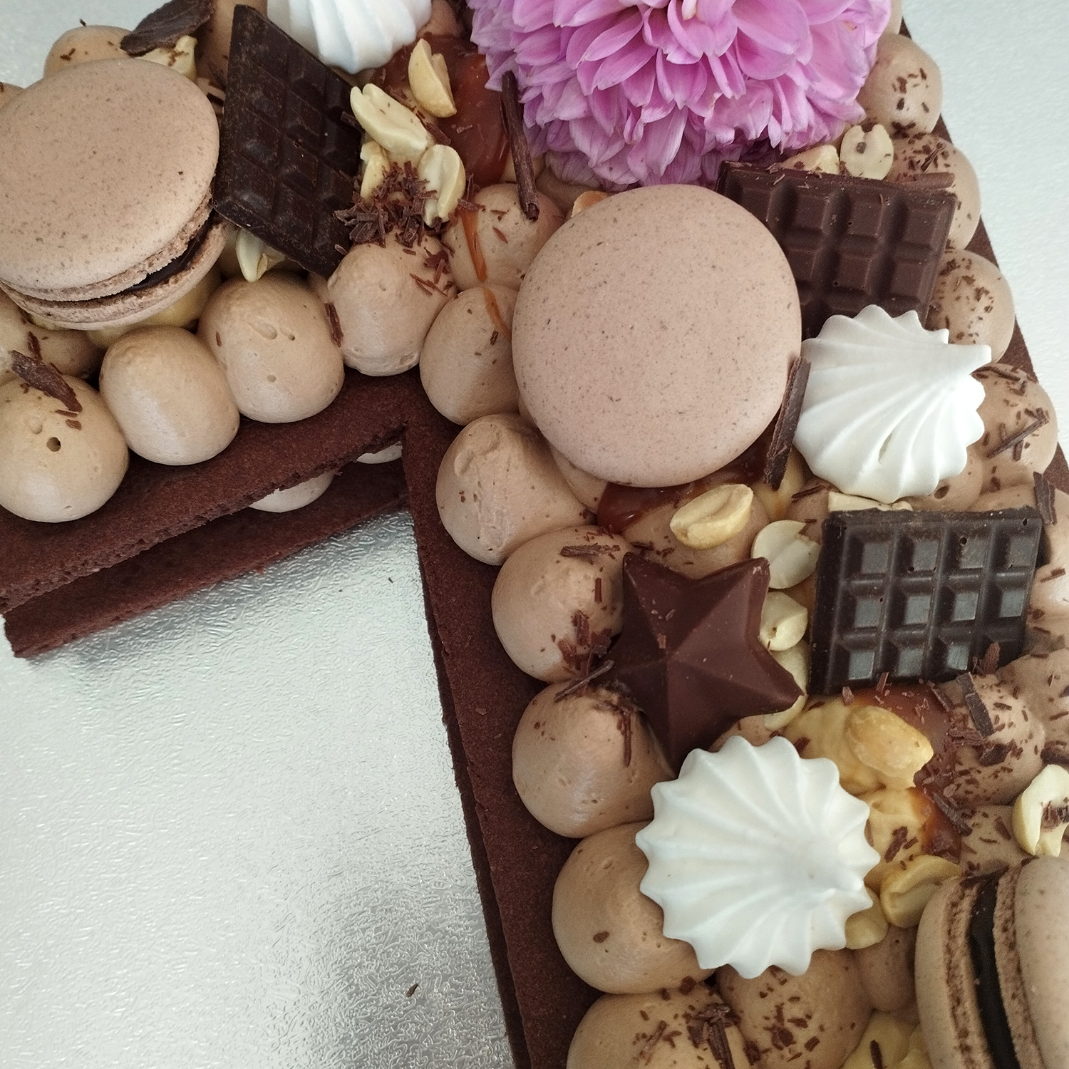 Pâte sucrée amande, ganache montée chocolat, caramel au beurre salé, crémeux caramel, cacahuète, macarons. Allergène 1/2/3/4/5/6