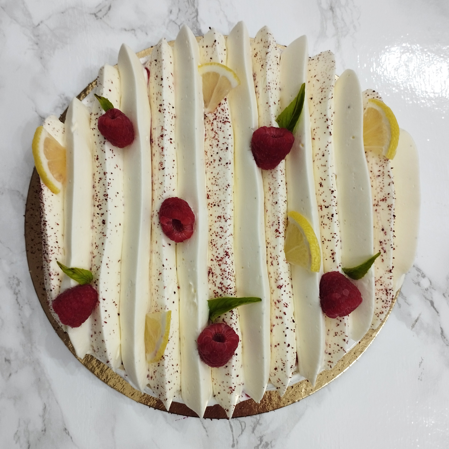 Meringue, crème légère vanille, crémeux citron, framboises fraîches. Sans gluten. Allergènes 2/3/5