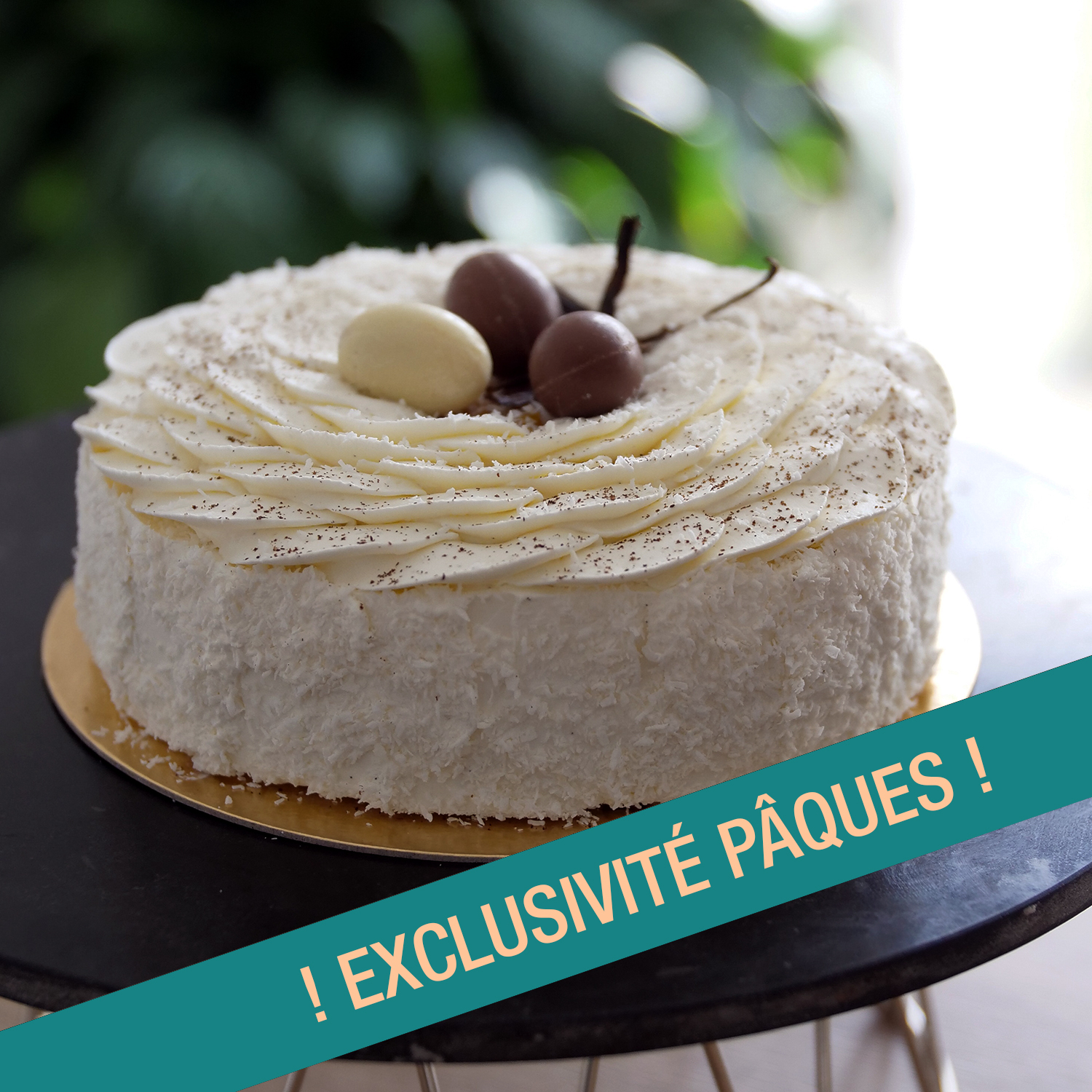 Génoise moelleuse, gelée mangue passion, croustillant praliné coco, chantilly vanille, œufs en chocolat cœur praliné. Allergènes 1/2/3/4 | 6 parts : 34€ | 8 parts : 42€